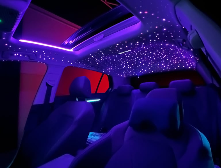 Creëer een magische sfeer met onze op maat gemaakte sterrenhemel-installaties en vallende sterren voor jouw voertuig.